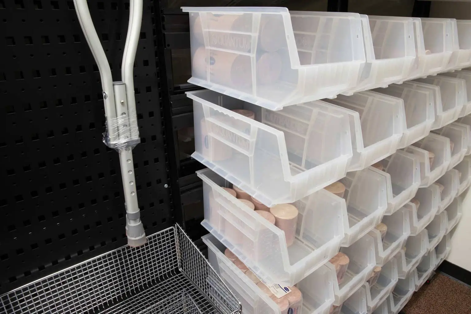 College and professional team trainers and sports medicine staff need space to store everything from crutches and braces to over-the-counter medications and bandages. Due to the prices and nature of what is being stored, security is a priority, but the many small supplies also must be organized and accessible. High-density mobile storage with accessories like bins, hooks, and drawers can be configured to make it easy to keep your athletes healthy.