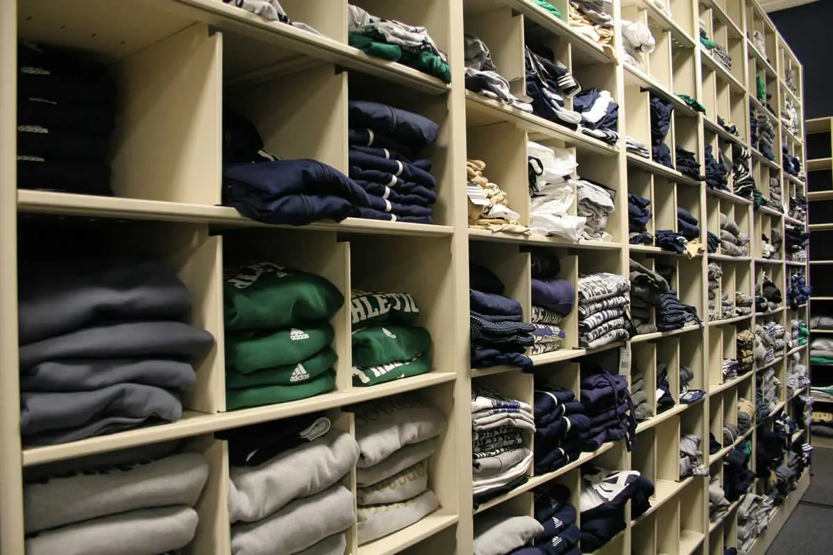 Game jerseys, practice pants, warmups, special event apparel, boxes of shoes, and endless amounts of socks are all easily tamed with a high-density mobile storage system configured to match your team’s needs. We’ll help you design the perfect combination of classic shelves, hanging racks, bins, and drawers to organize every piece of apparel.